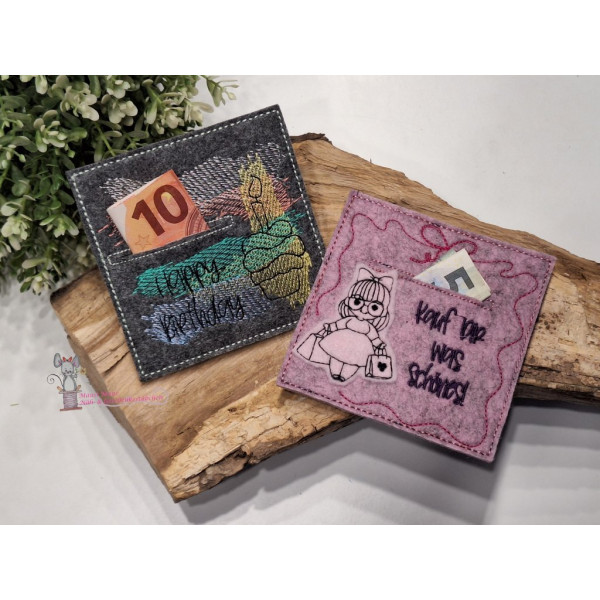 Du bekommst diese Datei "ITH Geld- oder Gutscheinkartenhülle", mit den 10 angezeigten Motiven in 10cm, 13cm und 15cm.