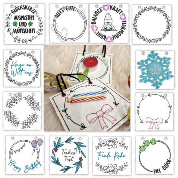 Die Stickdatei ist für einen Kerzenuntersetzer, der als Tasche mit Ösen gestickt wird. Durch die Ösen kann ein Band/Schleife gezogen werden.