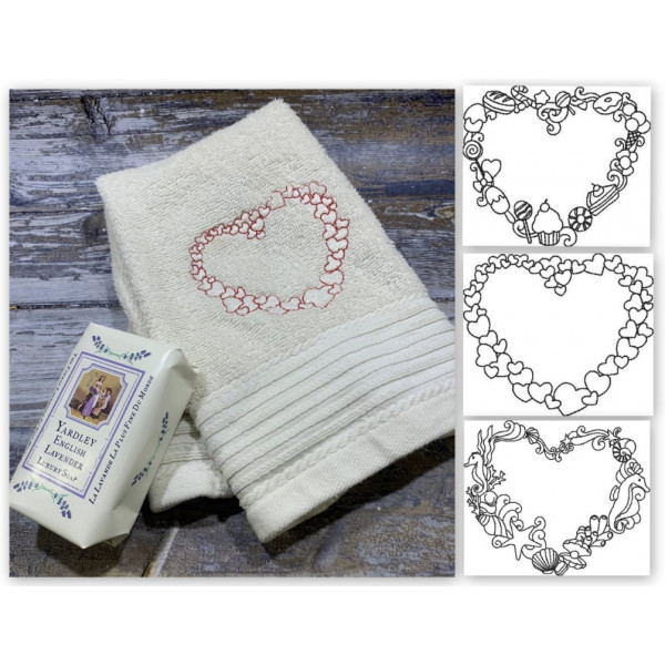 Du bekommst diese Datei "Sweet Magic Herzen", wie angezeigt, mit drei Motiven in Redwork jeweils in den Größen 10x8cm, 13x10cm, 15x13cm, 18x16cm, 20x18cm, 21x18cm, 23x20cm.