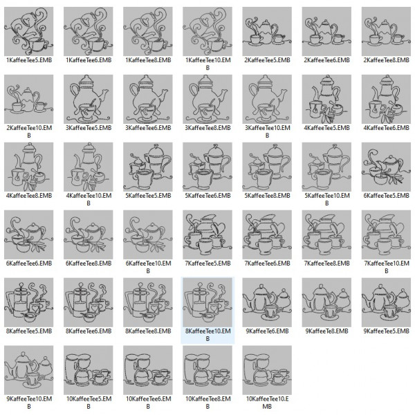 Du bekommst diese Datei "Kaffee und Tee", wie angezeigt, mit 10 Motiven in je 4 Größen - 5cm, 6cm, 8cm, 10cm.