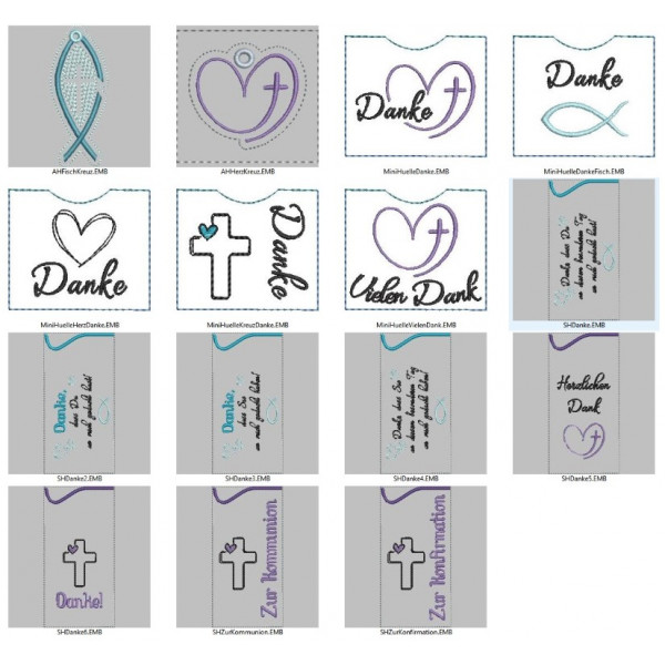 Du bekommst diese Stickserie ITH Christliche Motive, wie abgebildet, mit 8 Hüllen in länglich (ca 18x9cm) , 5 Hüllen in klein (ca 5x6cm) , zwei Anhängern (Fisch ca 8x4cm und Herz ca 6cm).