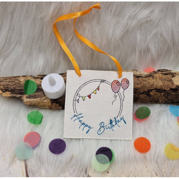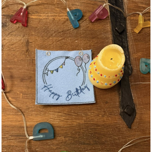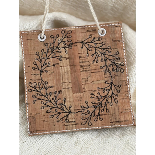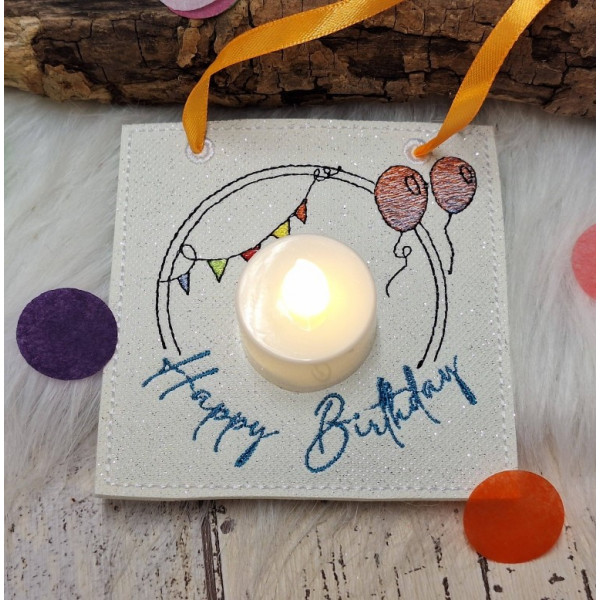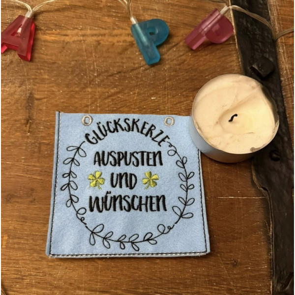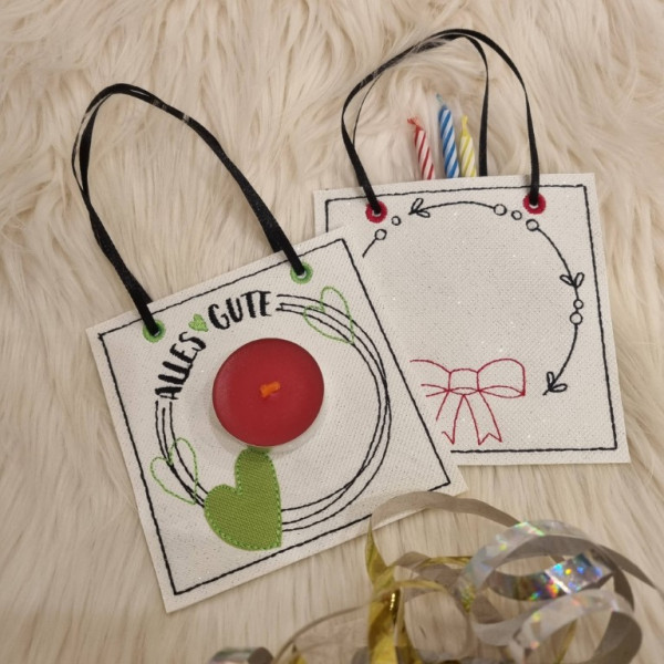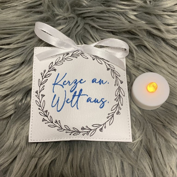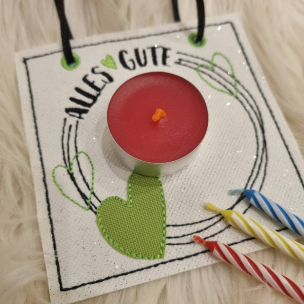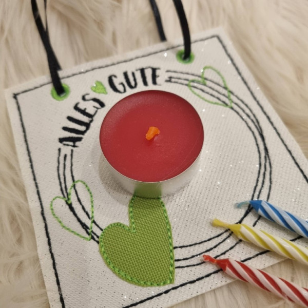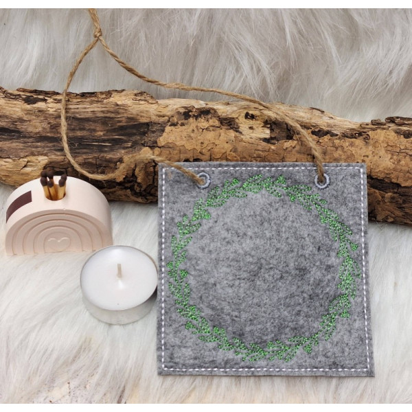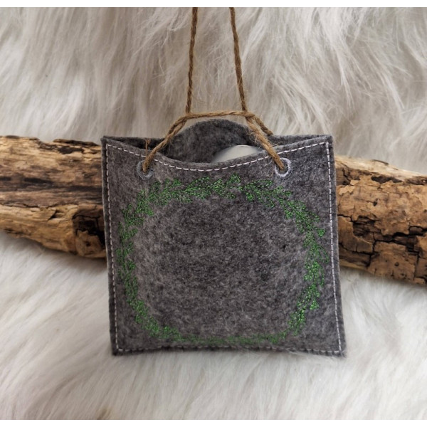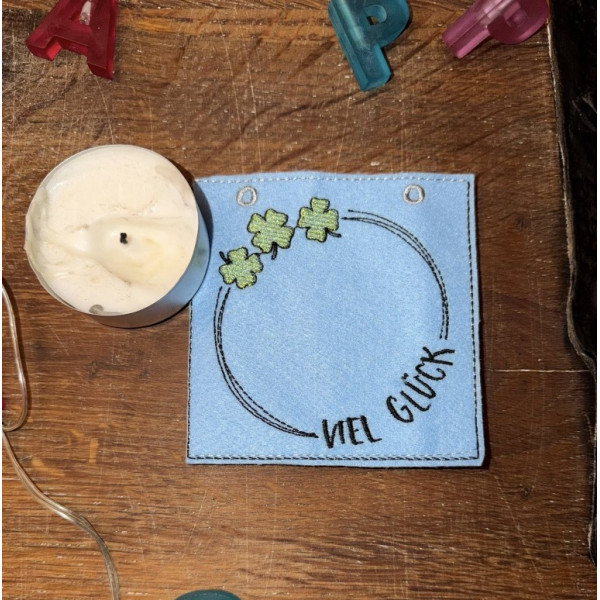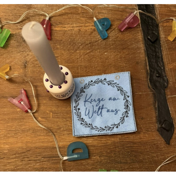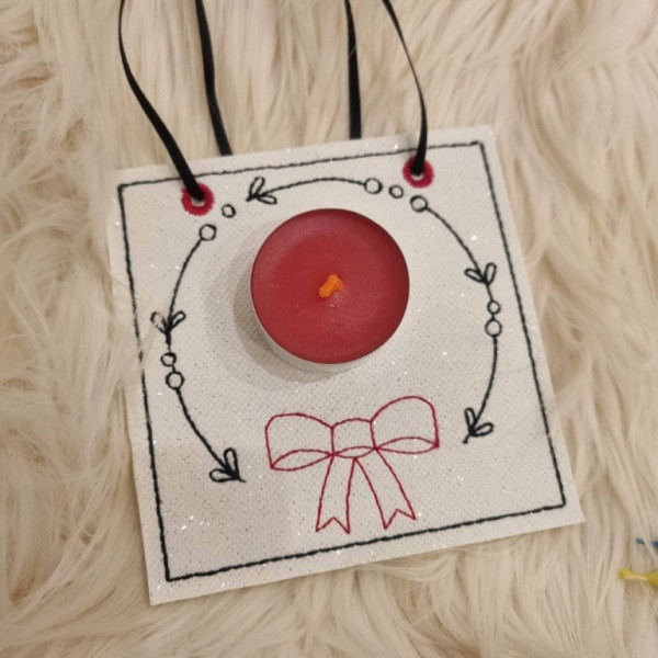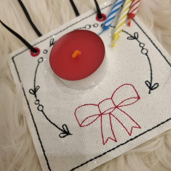 Die Stickdatei ist für einen Kerzenuntersetzer, der als Tasche mit Ösen gestickt wird. Durch die Ösen kann ein Band/Schleife gezogen werden.