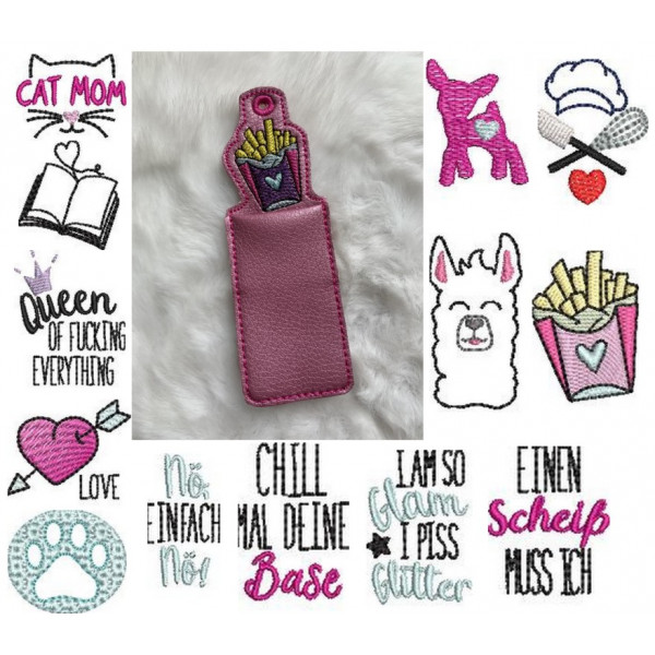Du bekommst diese Datei "Lippenbalsam Tasche ITH" mit den abgebildeten 14 Motiven, in der Größe 38x116mm.