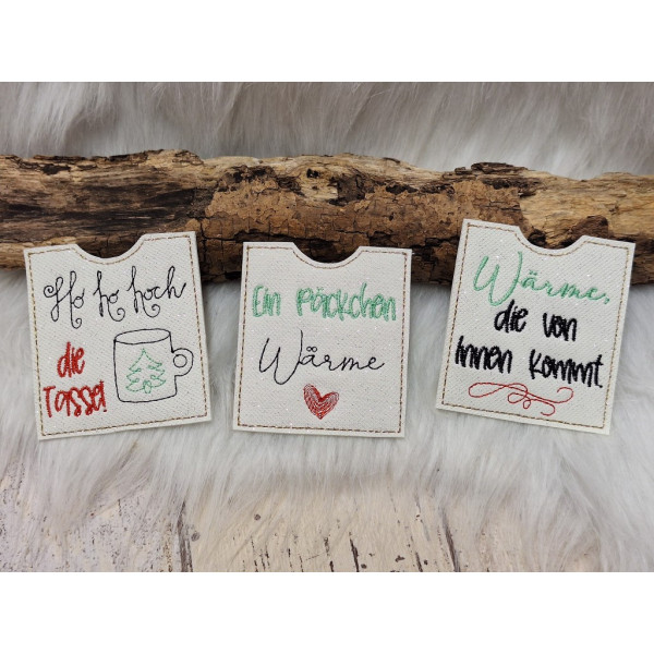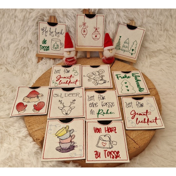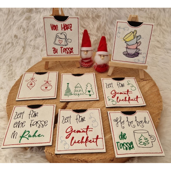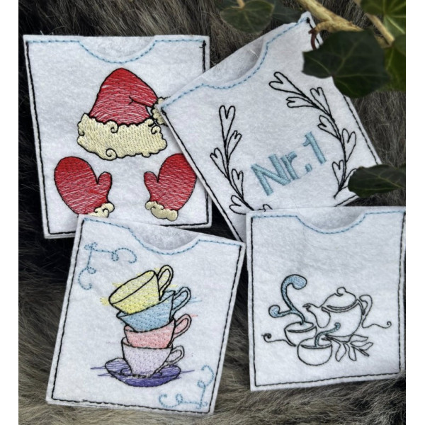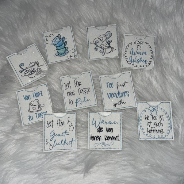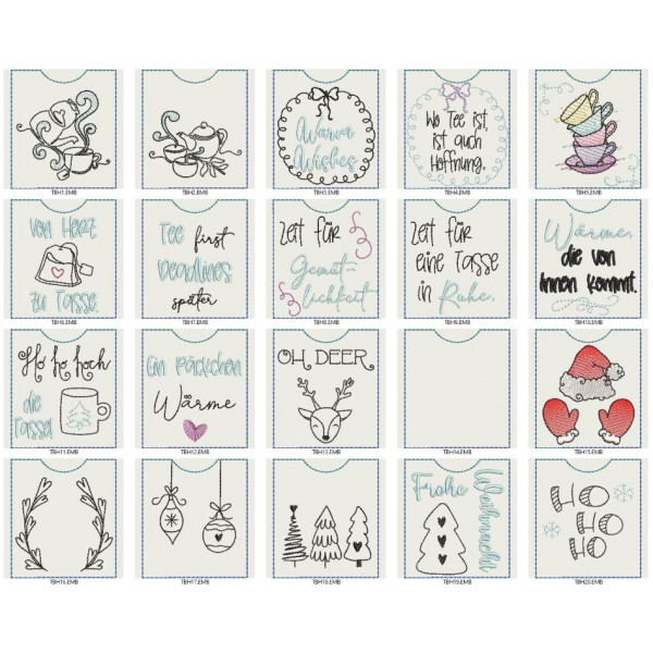 Du bekommst diese Datei "ITH Teebeutel Verpackung", wie angezeigt, mit 20 Motiven, wie angezeigt.